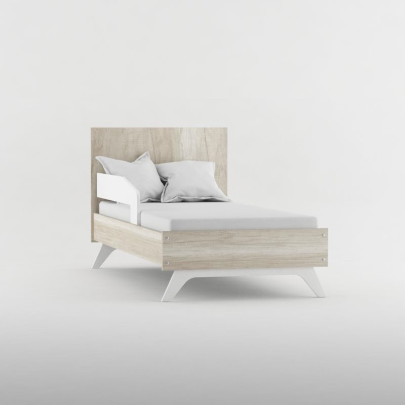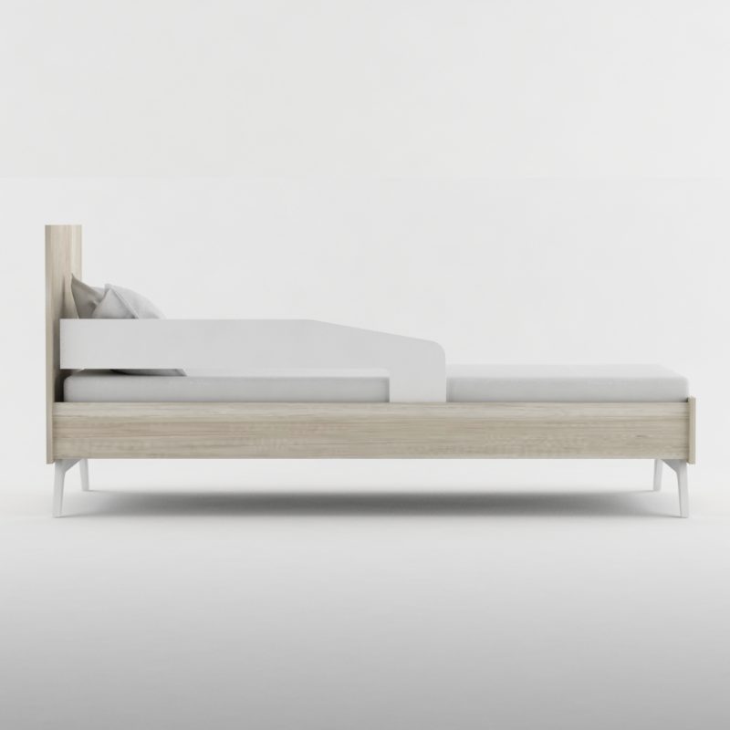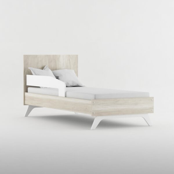 Cama con baranda Linnea. Estructura de melamina textura barrique con patas y baranda laqueadas en blanco.