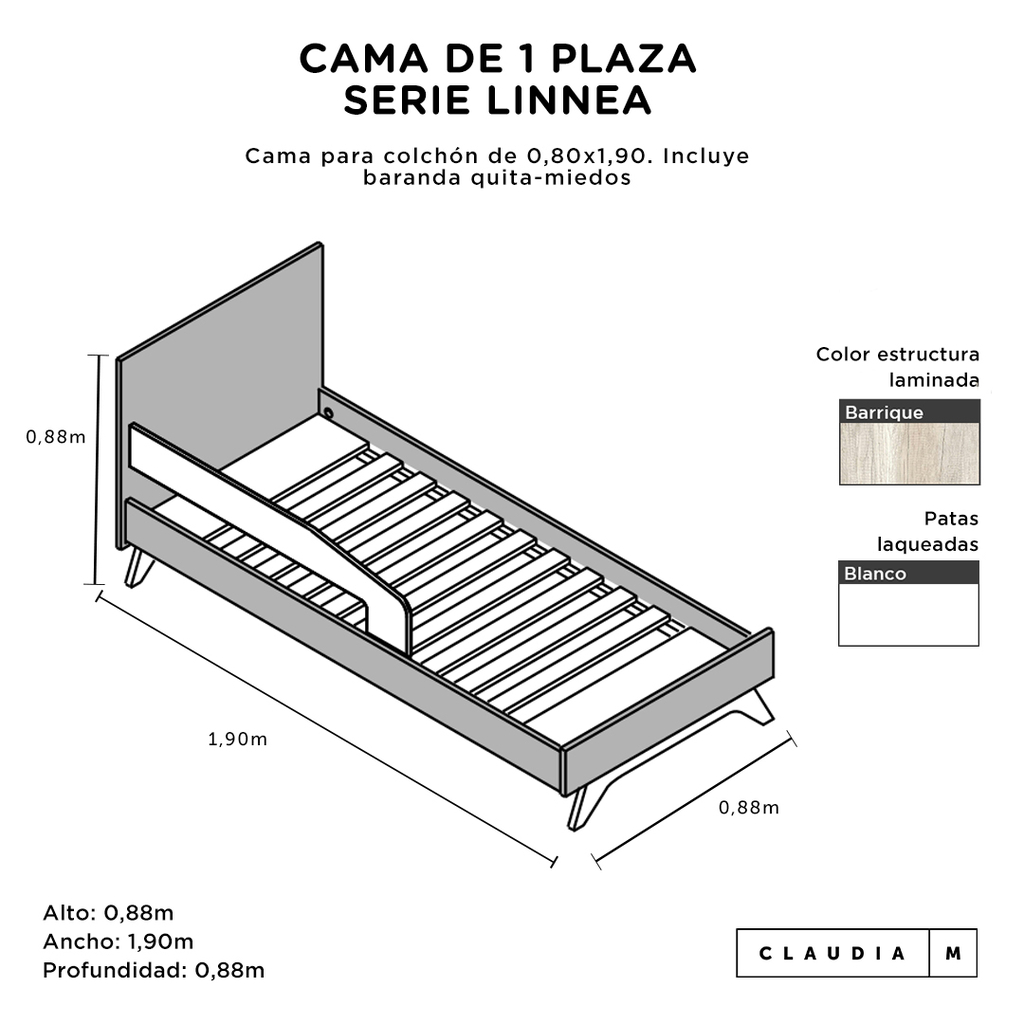 La cama Linnea cuenta con una baranda adicional para anexar cuando sea usada para niños chicos que aún están acostumbrados a la baranda de cunas o funcionales. Esta baranda se puede quitar cuando ya no sea necesario.