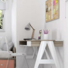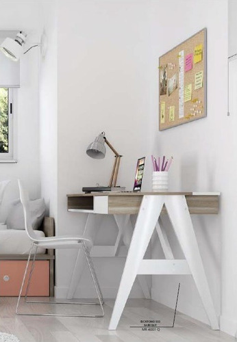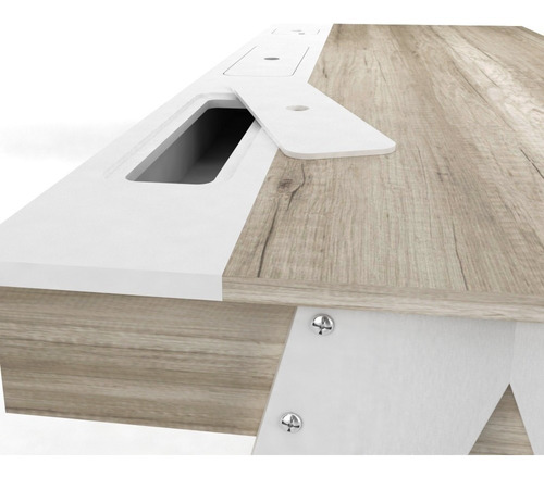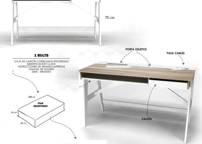Bandeja inferior porta notebook/libros, cajón con guías metálicas, gavetas traseras y pasa-cables.