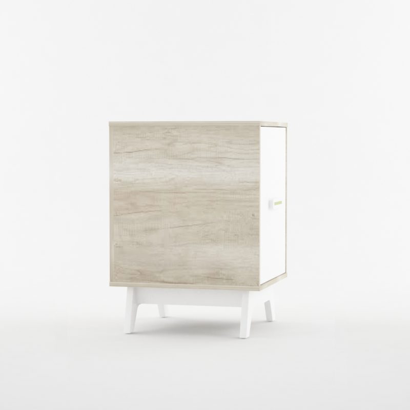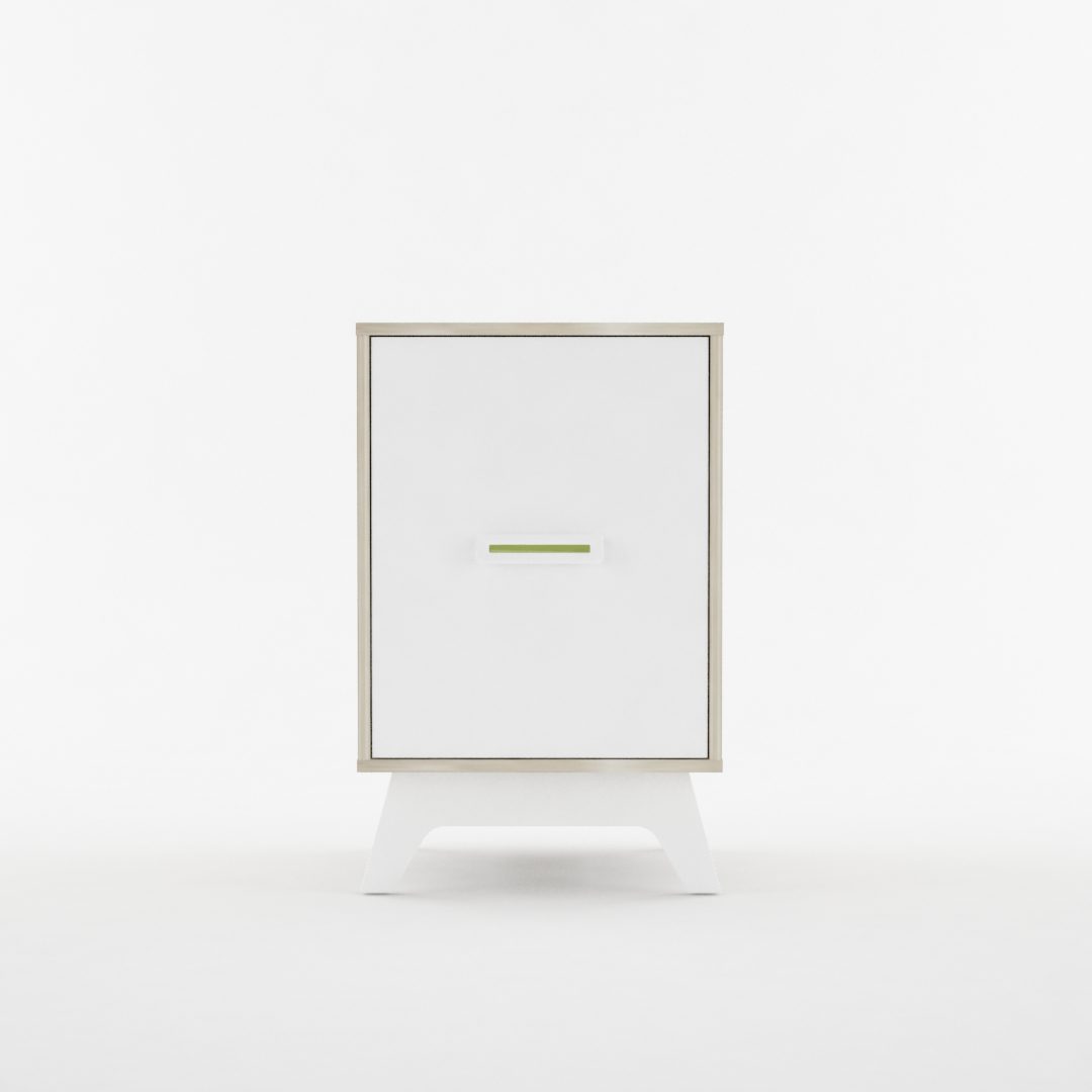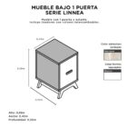 Mueble bajo de una puerta con estructura melamina barrique y frente laqueado blanco. El tirador es de modelo único con colores intercambiables. (ver imagen adjunta)